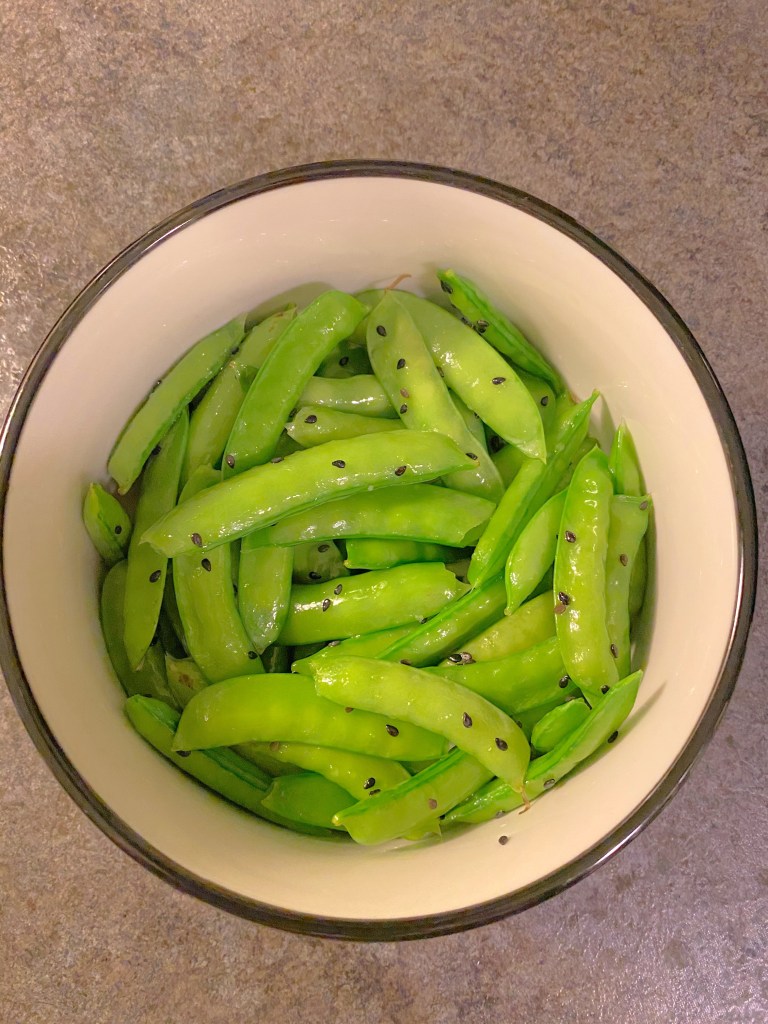 Add a few dashes of sesame oil to lightly cover peas then add black sesame seeds and a small dash of salt.