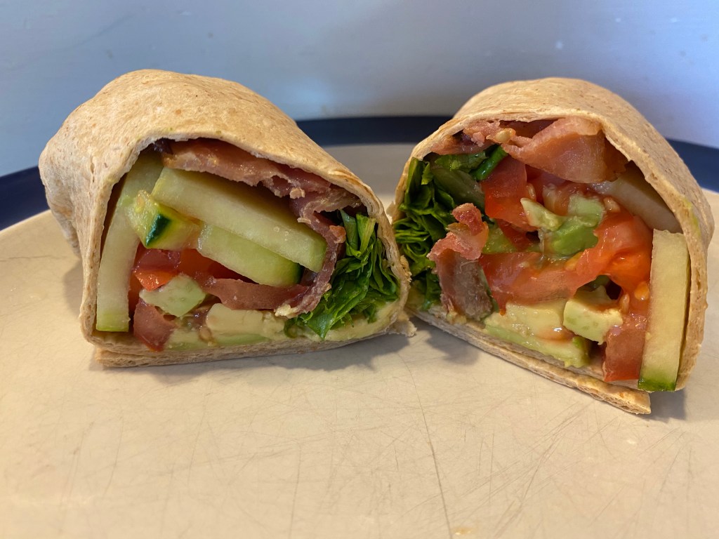 BLTCA Wrap- take a whole wrap and place bacon, chopped lettuce, sliced cucumbers, tomatoes and avocado and wrap. Slice in half.