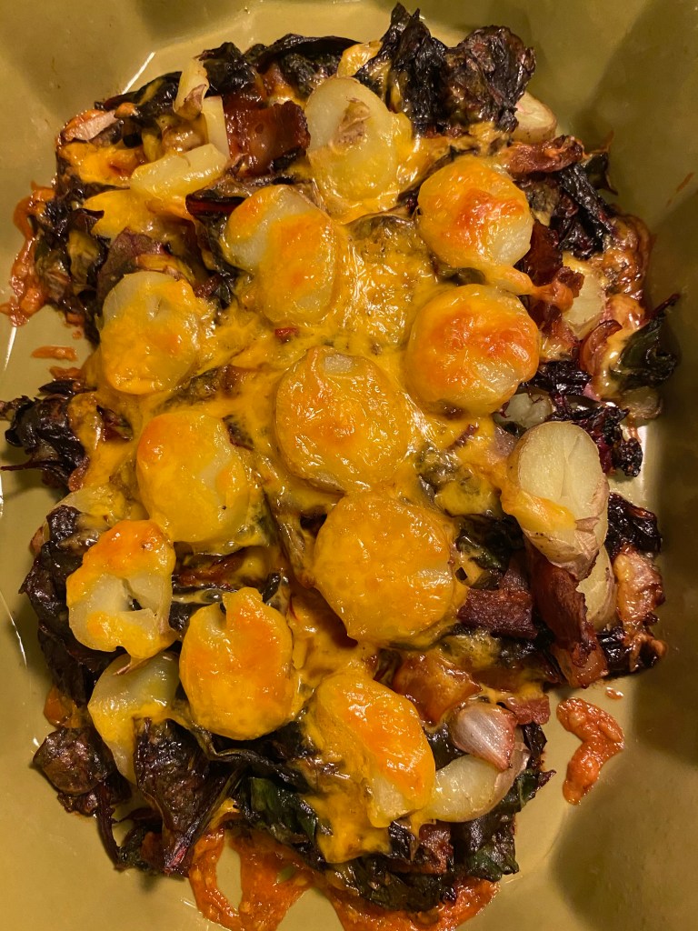Place half of chard mixture in the bottom of an oven safe dish. Top with half of the potatoes and a little cheese.