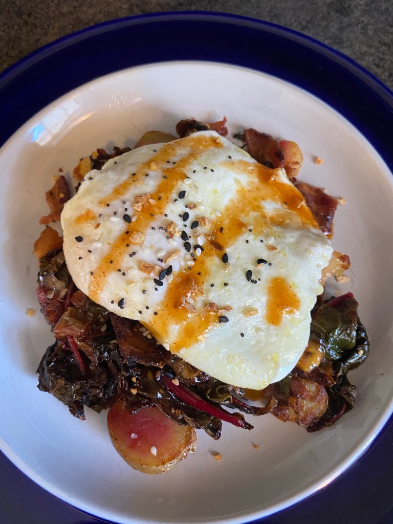 I use this as a breakfast casserole and make a very small batch as I only get a small portion of chard in my CSA. It’s great with an over medium egg on top or to serve as a side with meat.