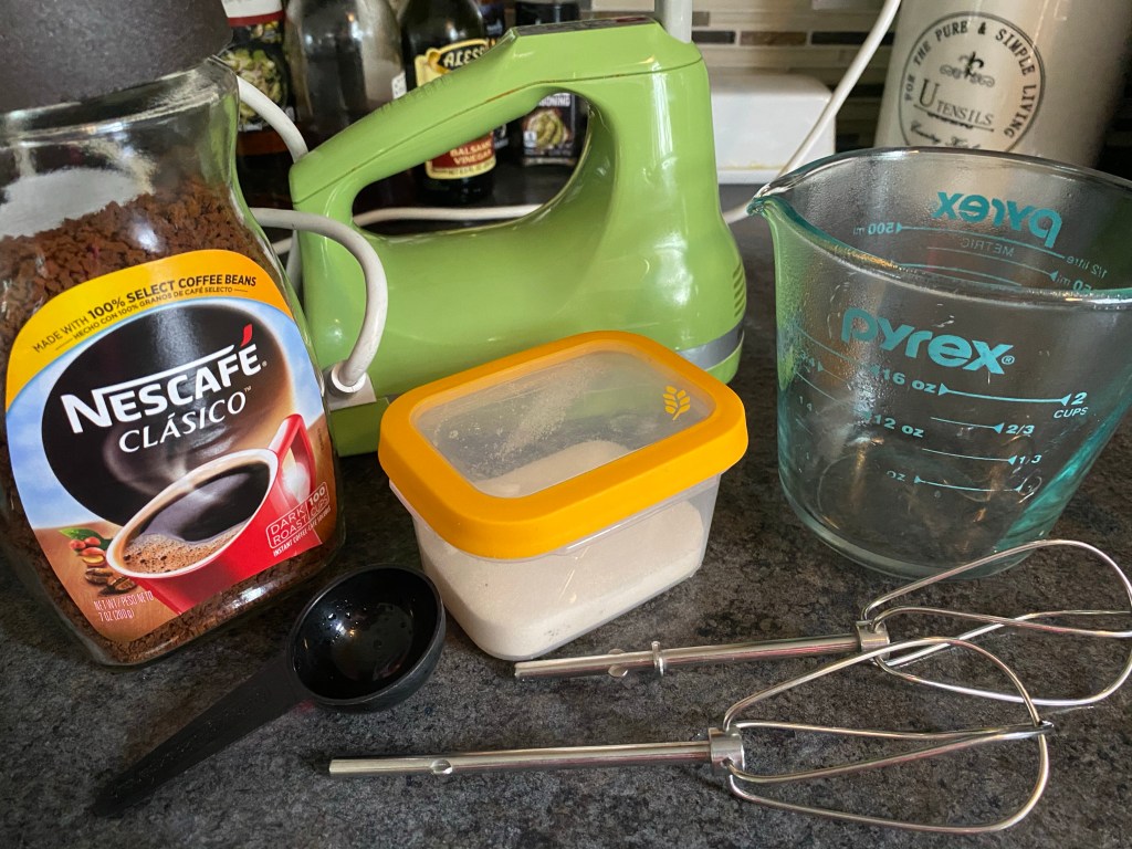 2 tablespoons of hot water- heat in measuring cup add 1 tablespoon of sugar and 2 tablespoons of instant coffee to warm water.