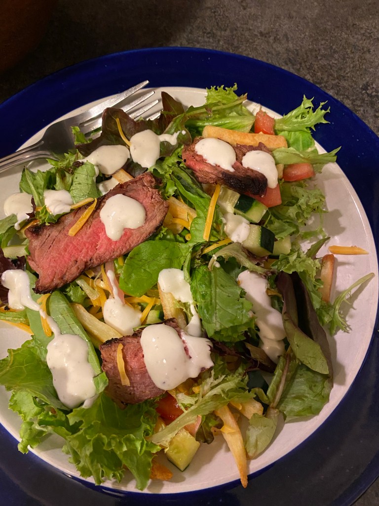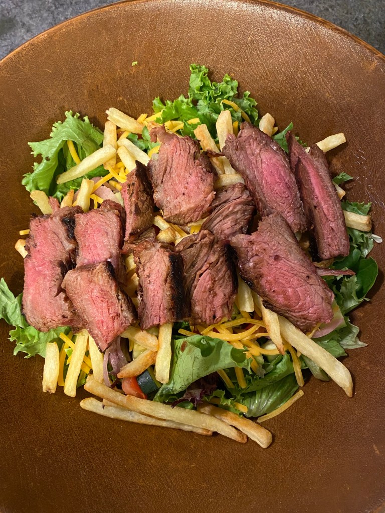 Chop lettuce and other vegetables and place in a bowl. Top with fries then shredded cheddar and finish with sliced steak