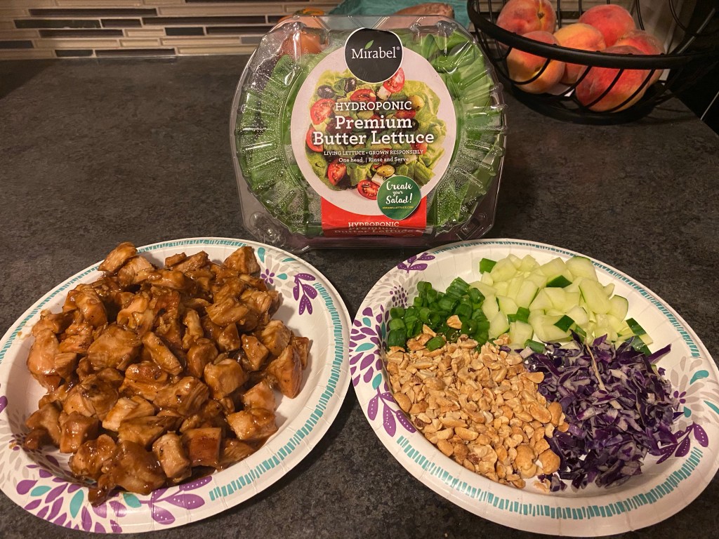 Pull apart lettuce leaves and place chicken in cup top with vegetables, peanuts, and fresh herb or your choice.