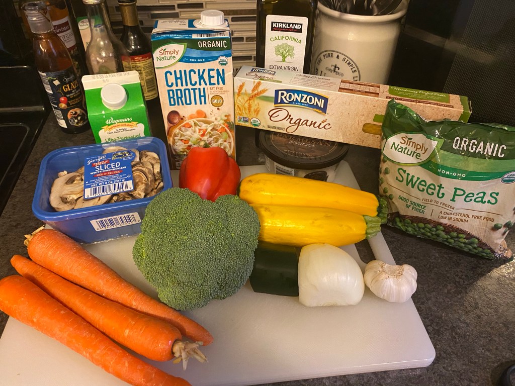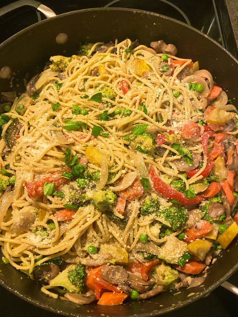 Stir in peas and S&P then return vegetables to pan. Stir in pasta then top with a little more parm and chopped basil.