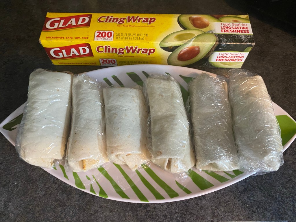Lay out tortillas and add a slice of cheese to each one. Spoon meat on top of cheese then roll up the burrito. Do the sides first and wrap with cling wrap.
