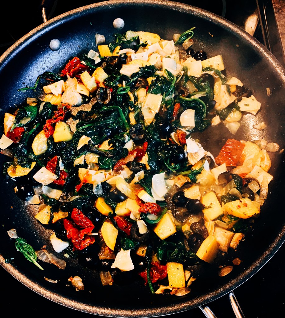 Pour evoo into skillet. On medium heat add onion to a skillet and cook for 3-4 minutes then add garlic and cook for 30 more seconds. Add the asparagus and sauté for 2-3 minutes. Add tomatoes, olives, artichokes, and cook for a minute. Add spinach and season with just a little S&P. Pour in broth to help the spinach wilt. Do not let the spinach in long. Remove vegetables to a plate after spinach wilts (no more than a minute or two).