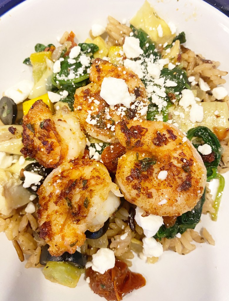 Put rice in the bottom of a bowl then top with vegetables, shrimp, and feta.