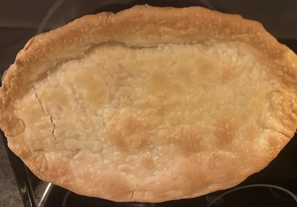 Place first pie crust on the bottom of your oval baking dish. Pour in filling and place second pie crust on top and pinch all the way around.