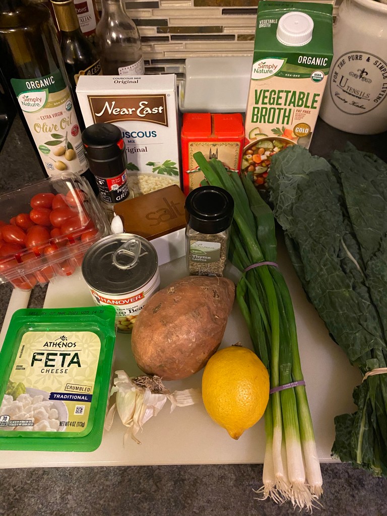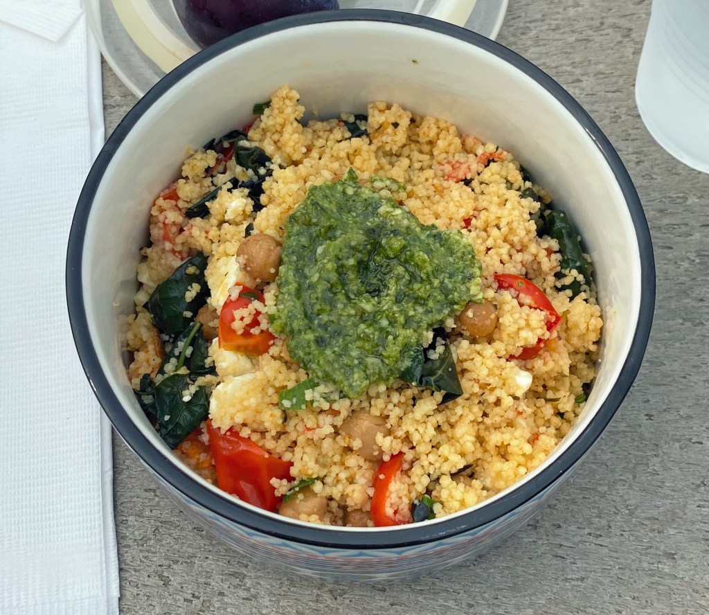 Mix all the vegetables with the couscous. Top with scallions, feta, lemon juice, and a dollop of pesto.