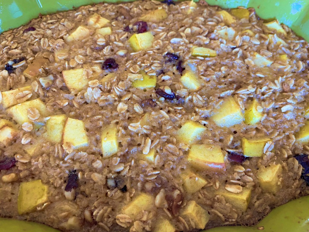 Combine dry ingredients in a medium sized bowl. Mix wet ingredients expect for butter and pour over dry ingredients. Stir and let them sit for 10 minutes while you clean up and chop your apple. Added melted butter to mixture. Place diced apples in bottom of dish and pour mixture over them and stir. Bake at 325 for 40 minutes.