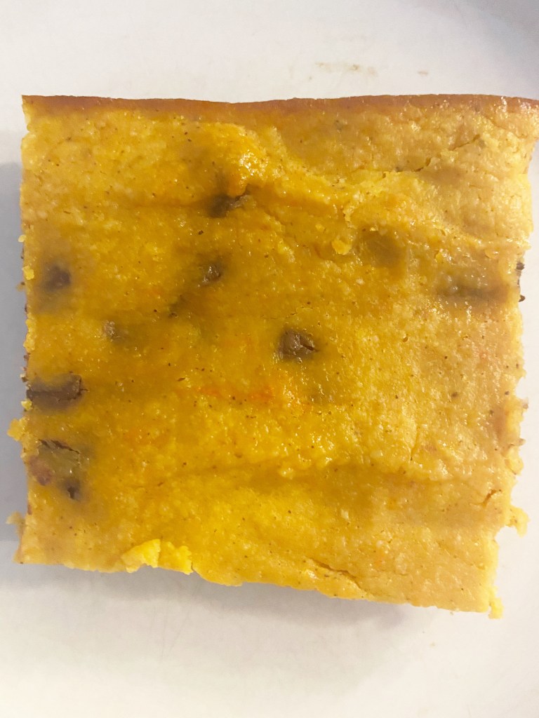 Throw everything but chips into a bowl and mix. Fold in chocolate chips and bake for 45 minutes. Let them cool then place in refrigerator. Best served cold.