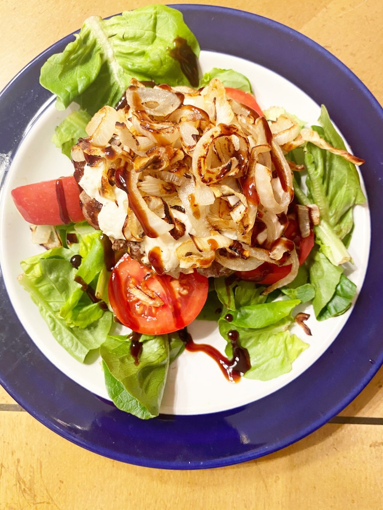Sauté onions on a very low heat while grilling burgers. Place cheese on top of cooked burger then top with onions. Place on a bed of butter lettuce and sliced tomatoes. Drizzle with balsamic glaze.