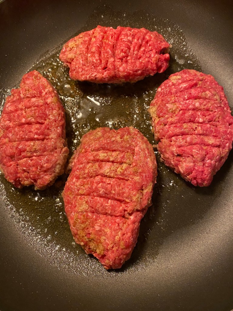 Form into 4-5 oval patties. Don’t make them too thick and use your fingers to make indentations.