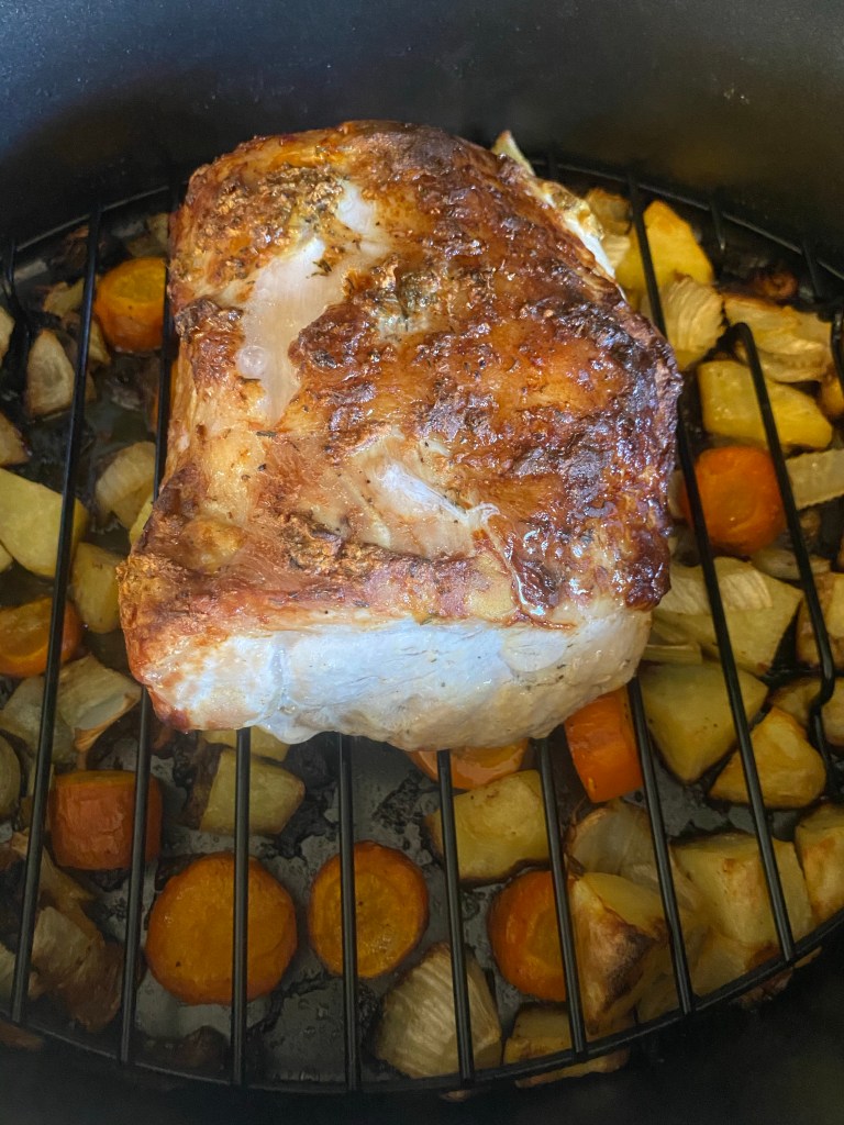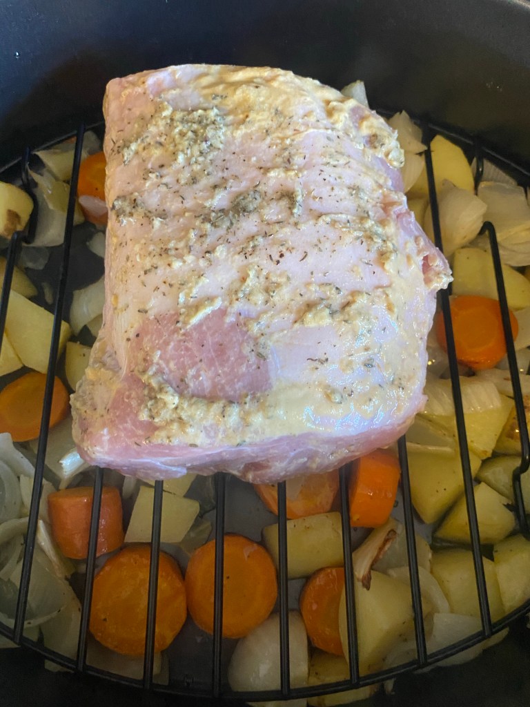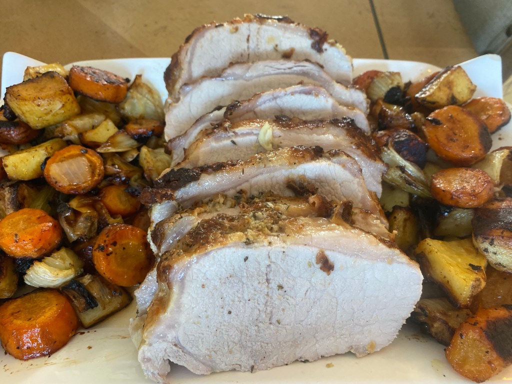 Remove the pan and place pork on top of vegetables and roast 45-50 minutes until thermometer reads 138.