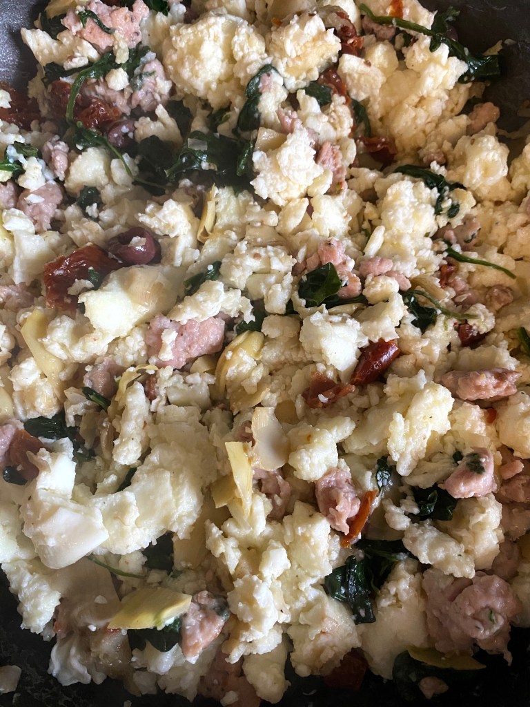 Add diced shallots/onions to skillet and cook for 2 minutes. Add all other ingredients except eggs and cook for a minute or two. Add wilted spinach, sausage and S&P then mix everything together for a minute.