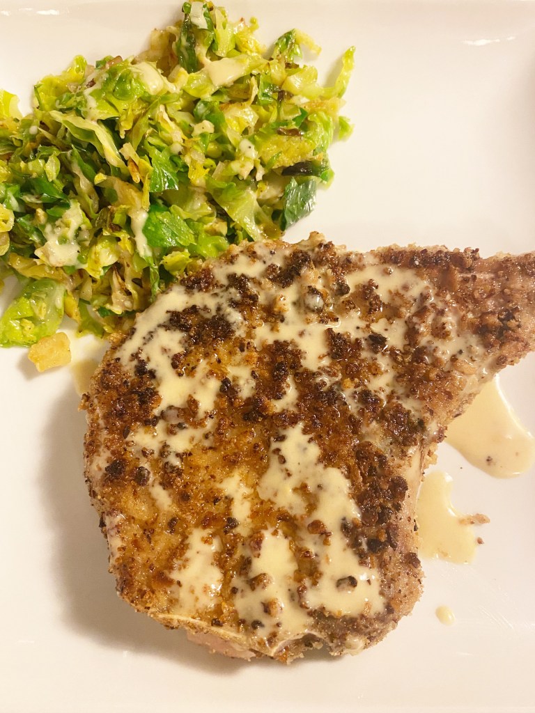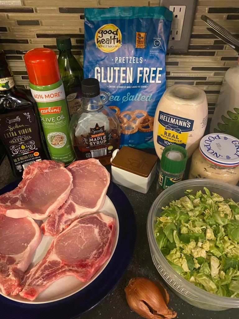 I use to watch 30 Minute Meals all the time when the Food Network aired cooking shows instead of contests. I watched Rachel use pretzels to coat pork and this gave me the inspiration for this meal. She served hers with sautéed red cabbage. I’m heavy on the Brussels sprouts right now so I used them. This meal looks fancy but it is not difficult to make and takes less than 20 minutes.