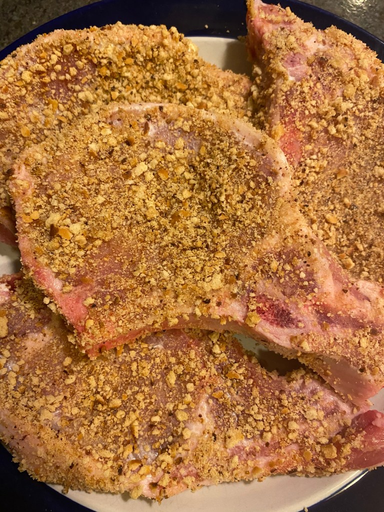 Coat pork with a little Mayo then coat with pretzel crumbs.