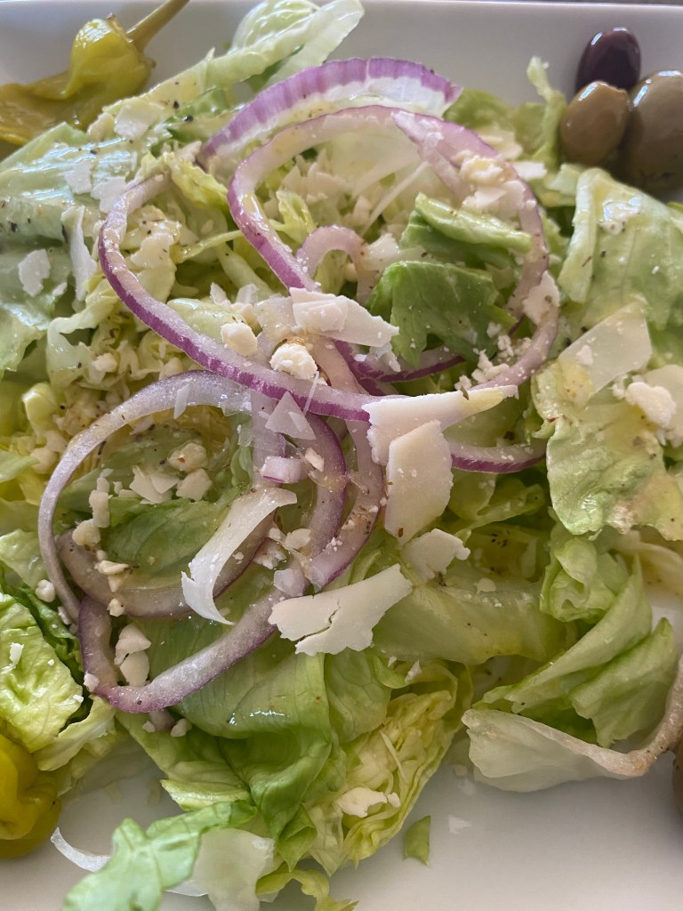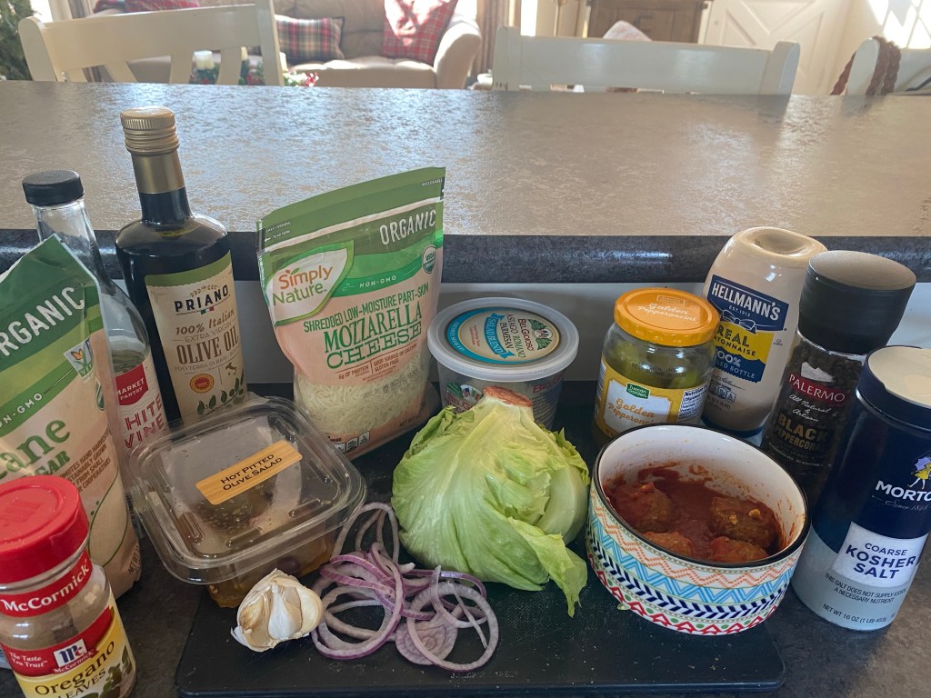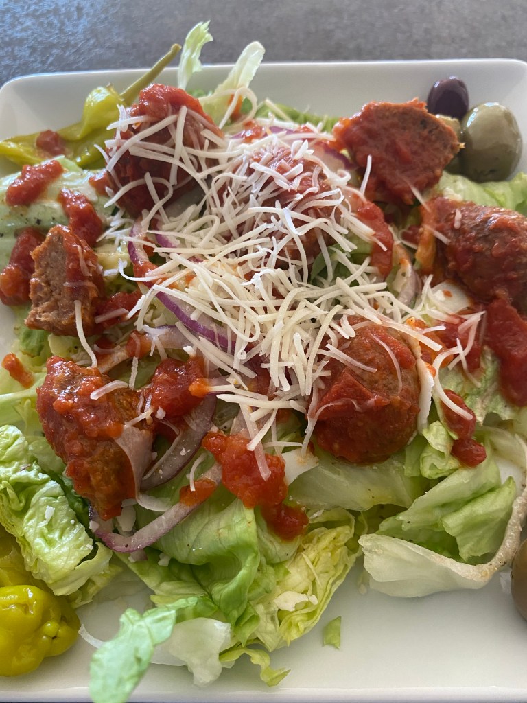 I make this salad https://www.bonappetit.com/recipe/iceberg-salad-with-italian-dressing then top with crockpot meatballs and sauce.