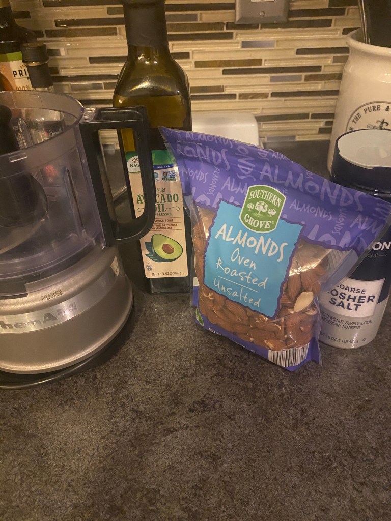 Pour almonds into a food processor and add salt. Purée while adding oil through the lid. It may seem a little runny but it will thicken in the refrigerator.