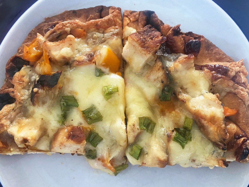 Place plum sauce on naan and sprinkle with the diced red peppers. Place on pizza stone and cook for 5 minutes. Remove add cheese, chicken, and scallions. Cook for 10-12 more minutes.