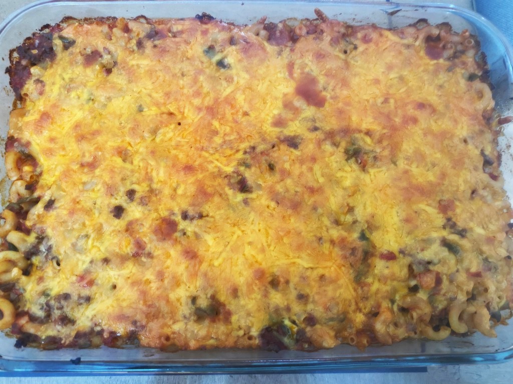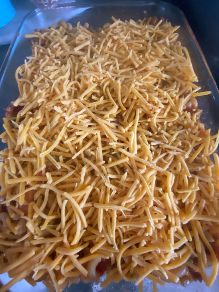 Drain pasta then add to pan and stir. Turn off heat and dump everything into glass baking sheet. Add cheese. Cook for 30 minutes.
