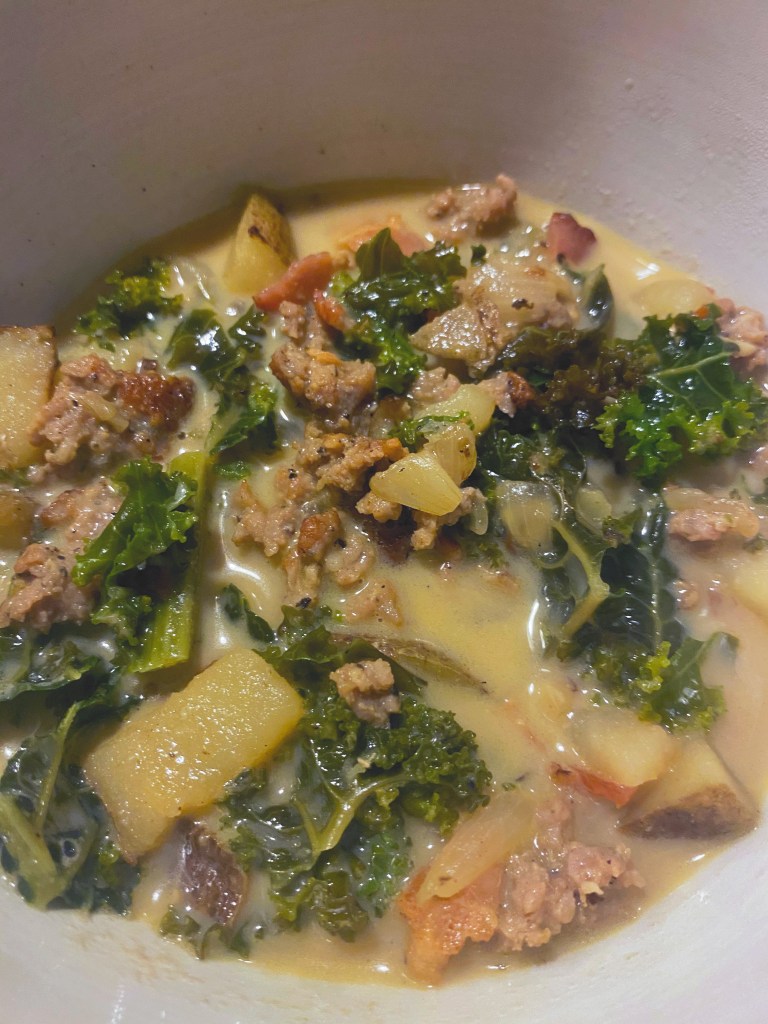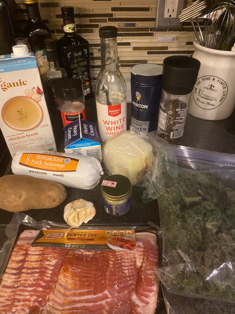 Then add rest of broth, cream, bacon, and sausage. Cook on medium heat for 5 more minutes. Finish with vinegar.