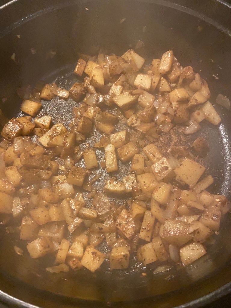 Cook bacon in a Dutch oven. Remove to plate lined with a paper towel. Then cook sausage and remove to plate. Add diced potatoes and onions and cook six minutes then add garlic, S&P and red pepper. Cook for one more minute. Add two cups of stock enough to cover potatoes with a little extra room. Increase heat and cook until broth is almost gone about 10 minutes.