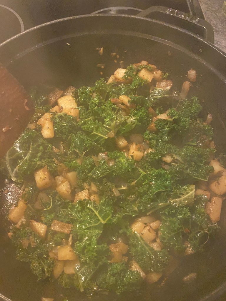 I am still using up frozen kale I have left from my produce share. I do not love kale in my smoothies as I prefer it cooked in soup or my kale breakfast casserole. This is a small batch of soup as I only had one potato. I can’t eat the same thing for days so I make only smaller batches of soup.