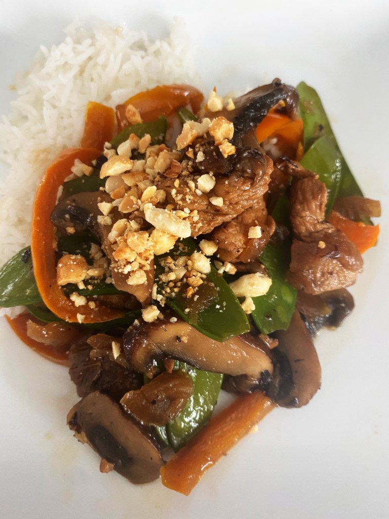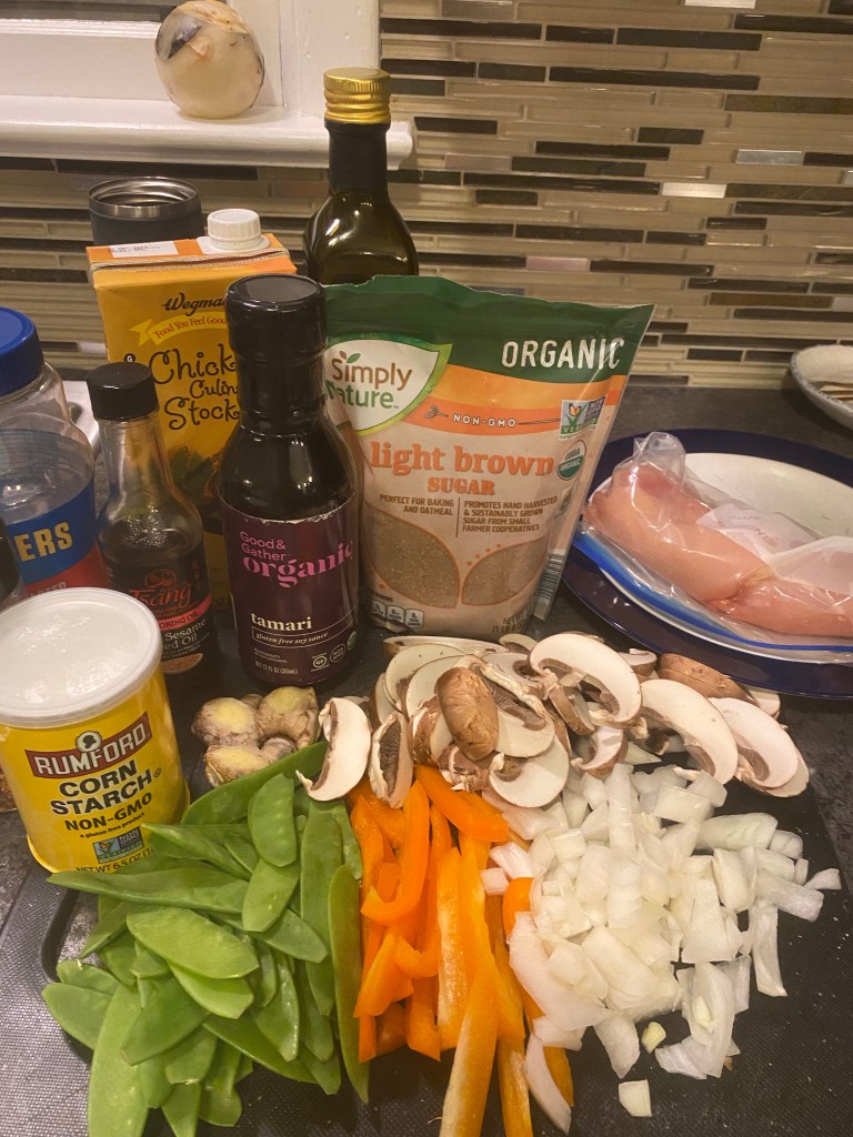 Heat oil on medium to high heat in a wok or large skillet. Add onion and cook 3 minutes. Add garlic for 30 seconds. Add chicken and cook 3-4 more minutes.
