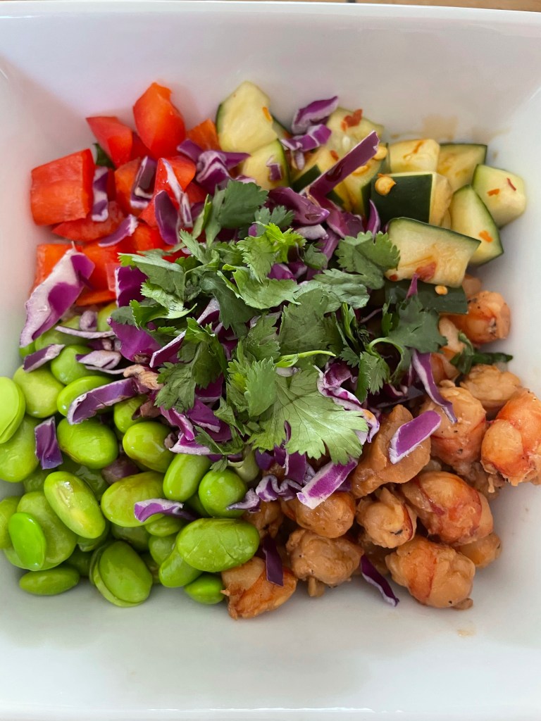 Place rice on the bottom of a bowl. Place shrimp on side then top with diced peppers, cucumbers, edamame, cabbage and more cilantro.