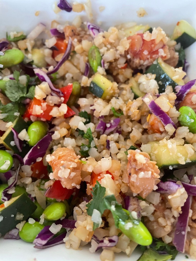 Cook cauliflower rice and edamame according to package. Add chopped cilantro and a few dashes of sesame oil and S&P to rice.