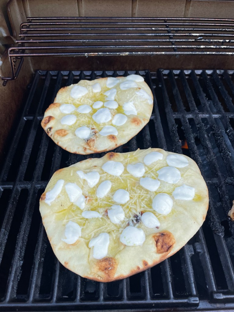 For pizza- rub naan bread with a little evoo then season with Italian seasoning. Top with and Italian cheese blend or with fresh mozzarella and parmigiana cheese. Grill on low until cheese is melted and naan is brown. This happens quick so don’t leave unattended. Check every minute until ready.