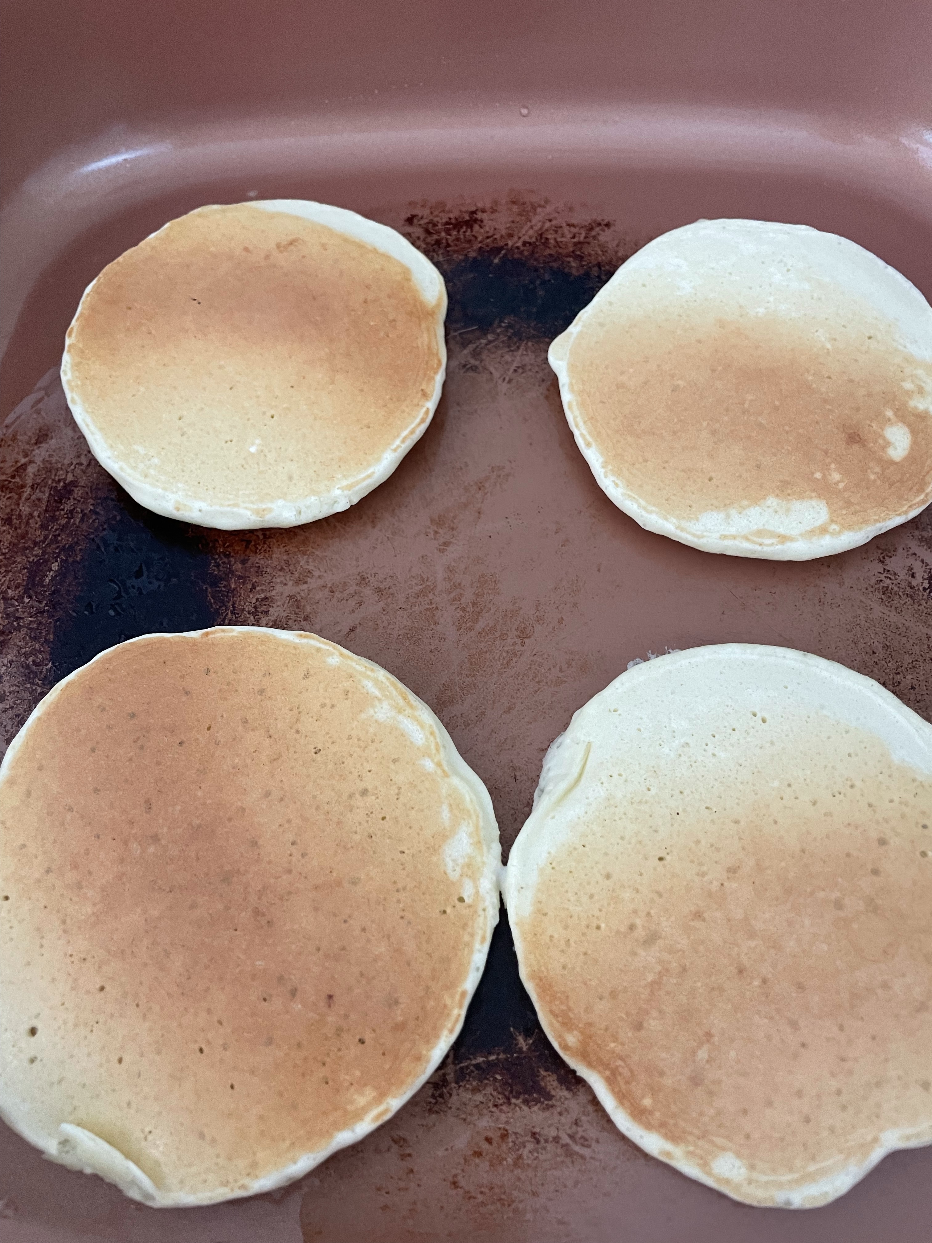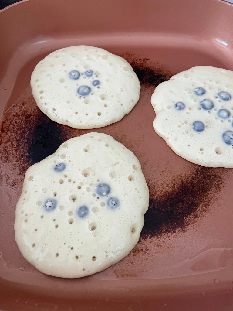 Mix all until blended but don’t over mix. Heat an eclectic skillet over medium and wipe with oil. Pour 3 to 4 pancakes at a time flip once they bubble all over. Add blueberries or chocolate chips.