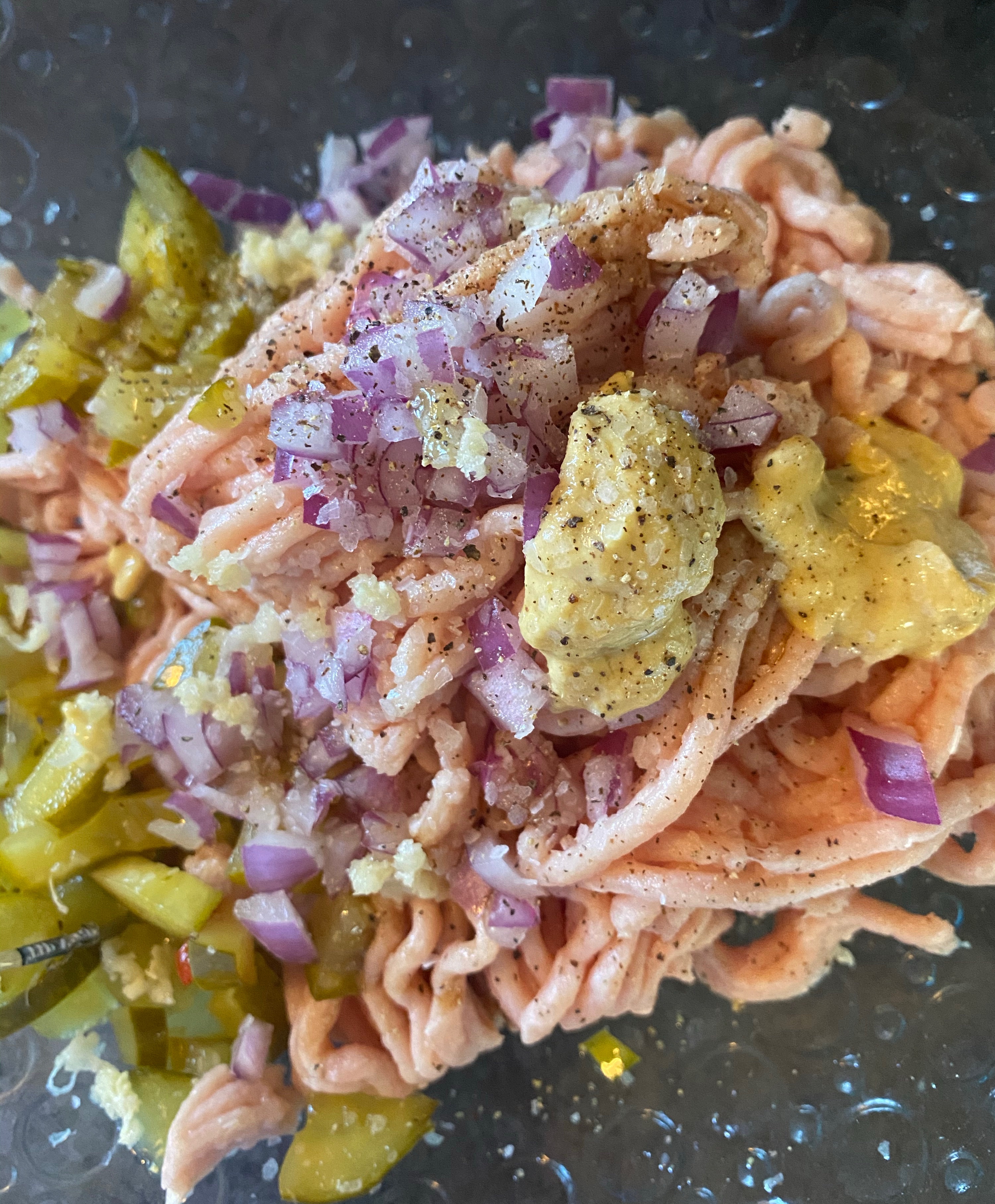 Rub pork with mustard then the herb mix. Let sit for 20 minutes.
